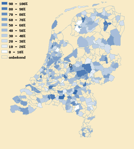 Totaalscore (inclusief eventuele correcties) in procenten  In principe kan een gemeente op vrijwel alle vragen 'ja' antwoorden. Voor elk positief antwoord zijn punten te behalen. De totaalscore (in procenten) geeft aan hoeveel procent positief beantwoord is. Uiteraard moet dit beeld gerelativeerd worden. We kunnen veel vragen niet stellen. Maar het resultaat is een goede indicatie van de prestatie van de gemeente.   41  %
