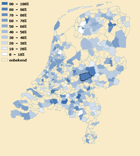 Totaalscore (inclusief eventuele correcties) in procenten  In principe kan een gemeente op vrijwel alle vragen 'ja' antwoorden. Voor elk positief antwoord zijn punten te behalen. De totaalscore (in procenten) geeft aan hoeveel procent positief beantwoord is. Uiteraard moet dit beeld gerelativeerd worden. We kunnen veel vragen niet stellen. Maar het resultaat is een goede indicatie van de prestatie van de gemeente.   89  %