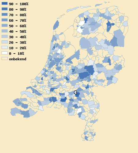 | Totaalscore (inclusief eventuele correcties) in procenten In principe kan een gemeente op vrijwel alle vragen 'ja' antwoorden. Voor elk positief antwoord zijn punten te behalen. De totaalscore (in procenten) geeft aan hoeveel procent positief beantwoord is. Uiteraard moet dit beeld gerelativeerd worden. We kunnen veel vragen niet stellen. Maar het resultaat is een goede indicatie van de prestatie van de gemeente. | 29 | % |