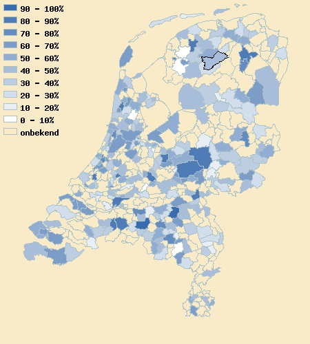 Totaalscore (inclusief eventuele correcties) in procenten  In principe kan een gemeente op vrijwel alle vragen 'ja' antwoorden. Voor elk positief antwoord zijn punten te behalen. De totaalscore (in procenten) geeft aan hoeveel procent positief beantwoord is. Uiteraard moet dit beeld gerelativeerd worden. We kunnen veel vragen niet stellen. Maar het resultaat is een goede indicatie van de prestatie van de gemeente.   43  %