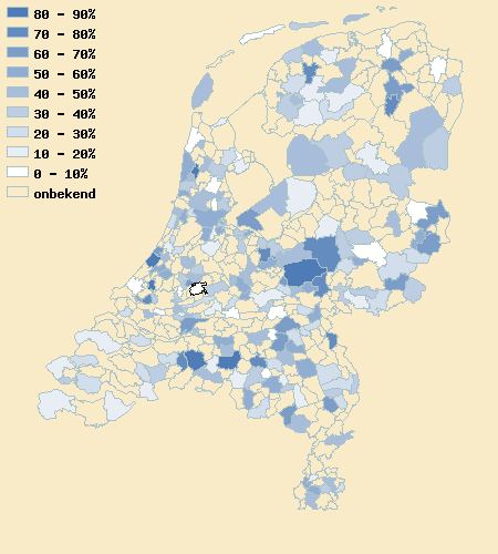 | Totaalscore (inclusief eventuele correcties) in procenten In principe kan een gemeente op vrijwel alle vragen 'ja' antwoorden. Voor elk positief antwoord zijn punten te behalen. De totaalscore (in procenten) geeft aan hoeveel procent positief beantwoord is. Uiteraard moet dit beeld gerelativeerd worden. We kunnen veel vragen niet stellen. Maar het resultaat is een goede indicatie van de prestatie van de gemeente. | 10 | % |