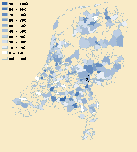 Totaalscore (inclusief eventuele correcties) in procenten  In principe kan een gemeente op vrijwel alle vragen 'ja' antwoorden. Voor elk positief antwoord zijn punten te behalen. De totaalscore (in procenten) geeft aan hoeveel procent positief beantwoord is. Uiteraard moet dit beeld gerelativeerd worden. We kunnen veel vragen niet stellen. Maar het resultaat is een goede indicatie van de prestatie van de gemeente.   56  %