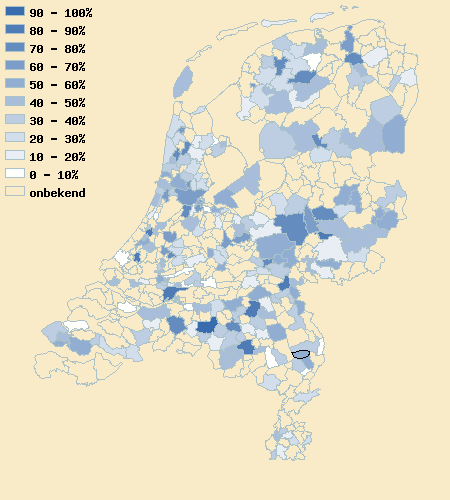 | Totaalscore (inclusief eventuele correcties) in procenten In principe kan een gemeente op vrijwel alle vragen 'ja' antwoorden. Voor elk positief antwoord zijn punten te behalen. De totaalscore (in procenten) geeft aan hoeveel procent positief beantwoord is. Uiteraard moet dit beeld gerelativeerd worden. We kunnen veel vragen niet stellen. Maar het resultaat is een goede indicatie van de prestatie van de gemeente. | 56 | % |