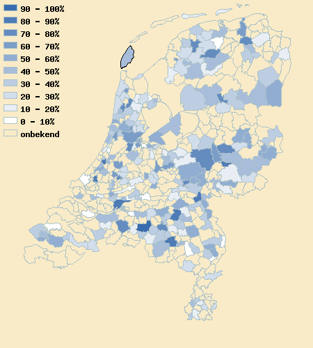 | Totaalscore (inclusief eventuele correcties) in procenten In principe kan een gemeente op vrijwel alle vragen 'ja' antwoorden. Voor elk positief antwoord zijn punten te behalen. De totaalscore (in procenten) geeft aan hoeveel procent positief beantwoord is. Uiteraard moet dit beeld gerelativeerd worden. We kunnen veel vragen niet stellen. Maar het resultaat is een goede indicatie van de prestatie van de gemeente. | 44 | % |