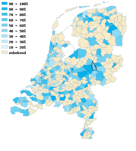 | Totaalscore (inclusief eventuele correcties) in procenten In principe kan een gemeente op vrijwel alle vragen 'ja' antwoorden. Voor elk positief antwoord zijn punten te behalen. De totaalscore (in procenten) geeft aan hoeveel procent positief beantwoord is. Uiteraard moet dit beeld gerelativeerd worden. We kunnen veel vragen niet stellen. Maar het resultaat is een goede indicatie van de prestatie van de gemeente. | 53 | % |