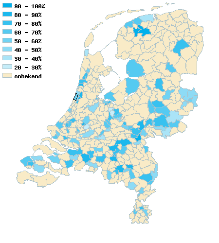 | Totaalscore (inclusief eventuele correcties) in procenten In principe kan een gemeente op vrijwel alle vragen 'ja' antwoorden. Voor elk positief antwoord zijn punten te behalen. De totaalscore (in procenten) geeft aan hoeveel procent positief beantwoord is. Uiteraard moet dit beeld gerelativeerd worden. We kunnen veel vragen niet stellen. Maar het resultaat is een goede indicatie van de prestatie van de gemeente. | 51 | % | ||